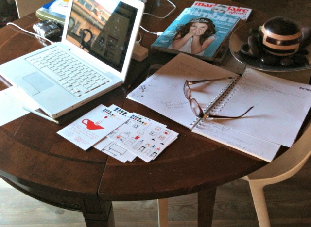 Sono in una fase di progettazione quindi: foglio sparsi, appunti vari, matite, l’i-phone, naturalmente il pc, il telefono fisso, cartoline della recente comunicazione, campioni di prodotto.