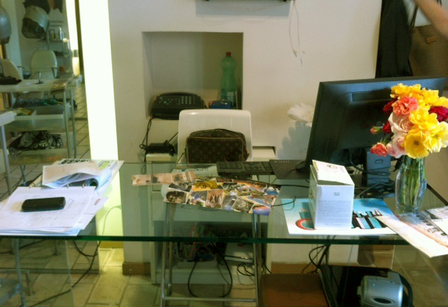 Non ho esattamente una scrivania ma un carrello colmo di spazzole, lacche, gel, pettini, ferri, piastre e un po’ di altre diavolerie.
