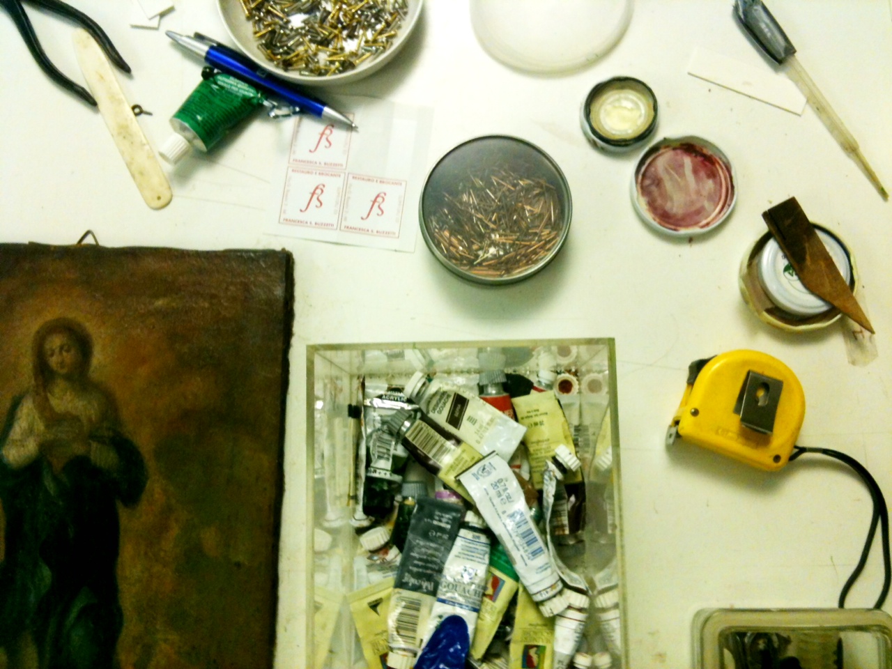 Tanti perché i lavori possono essere molto diversi, anche in base alle fasi di lavoro. Per la pulitura di un quadro uso una pinzetta. Molti attrezzi sono quelli dei medici o comunque si usano in ospedale: per la pulitura uso la pinzetta con del cotone che si immerge nel solvente oppure un pennello che si usa quando si fa la pulitura non con un solvente liquido ma con un gel. Il bisturi si usa in tantissime occasioni. Dal dentista abbiamo addirittura preso in prestito lo specillo per lavorare sul retro delle tele per fare delle suture del tessuto. Alcuni attrezzi sono nati con il restauro e sono per esempio il termocauterio che è un piccolo ferrettino che si usa per fare lavori molto puntuali. È come se fosse una spatolina che si riscalda controllando la temperatura in base ai vari interventi. Si usano materiali naturali: resine naturali, gesso, colle animali. Oppure materiali sintetici che da alcuni anni sono molto vari. Spesso si è a contatto con materiali tossici quindi si deve usare la mascherina per non inalare queste sostanze. Quando si arriva alla fase del ritocco pittorico si usano pennelli e colori particolari, alcuni usano le polveri, se no ci sono dei tubetti di colte cosiddetti a vernice che imitano l’olio ma asciugano molto più velocemente altrimenti il ritocco sarebbe lunghissimo. Il gesso viene usato per fare la stuccatura prima del ritocco. Gli acquerelli e le tempere vengono usati per fare le basi sopra il gesso bianco in modo da arrivare il più velocemente possibile al colore finale. Alcuni attrezzi si prendono in prestito da altri lavori, come i coltelli o i rasoi che venivano usati una volta per fare la barba vengono riadattati: sono un po’ più grossolani del bisturi e vengono usati per pulire il retro delle tele. Si usano quindi molti strumenti, molti moderni e molti “antichi”. Ogni materiale ti costringe ad una manualità diversa.
